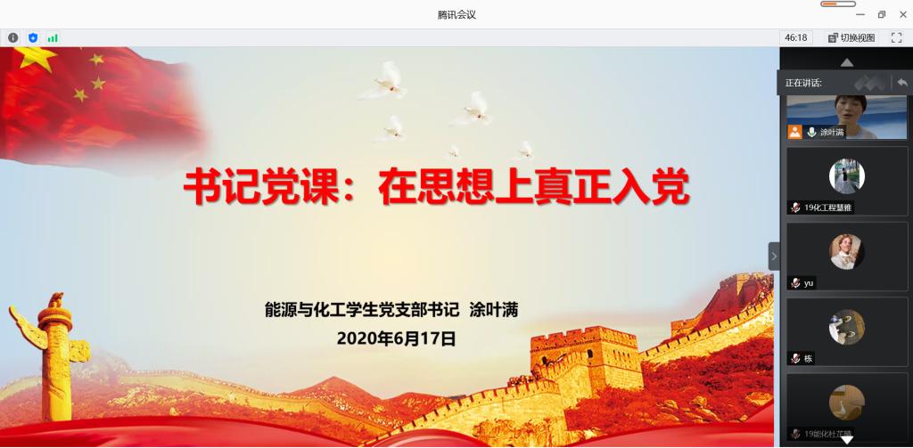 6月17日,我院能源与化工学生党支部第八期34名入党积极分子齐聚腾讯会议,认真聆听学习了能源与化工学生党支部书记涂叶满书记讲授的党课《在思想上真正入党》。