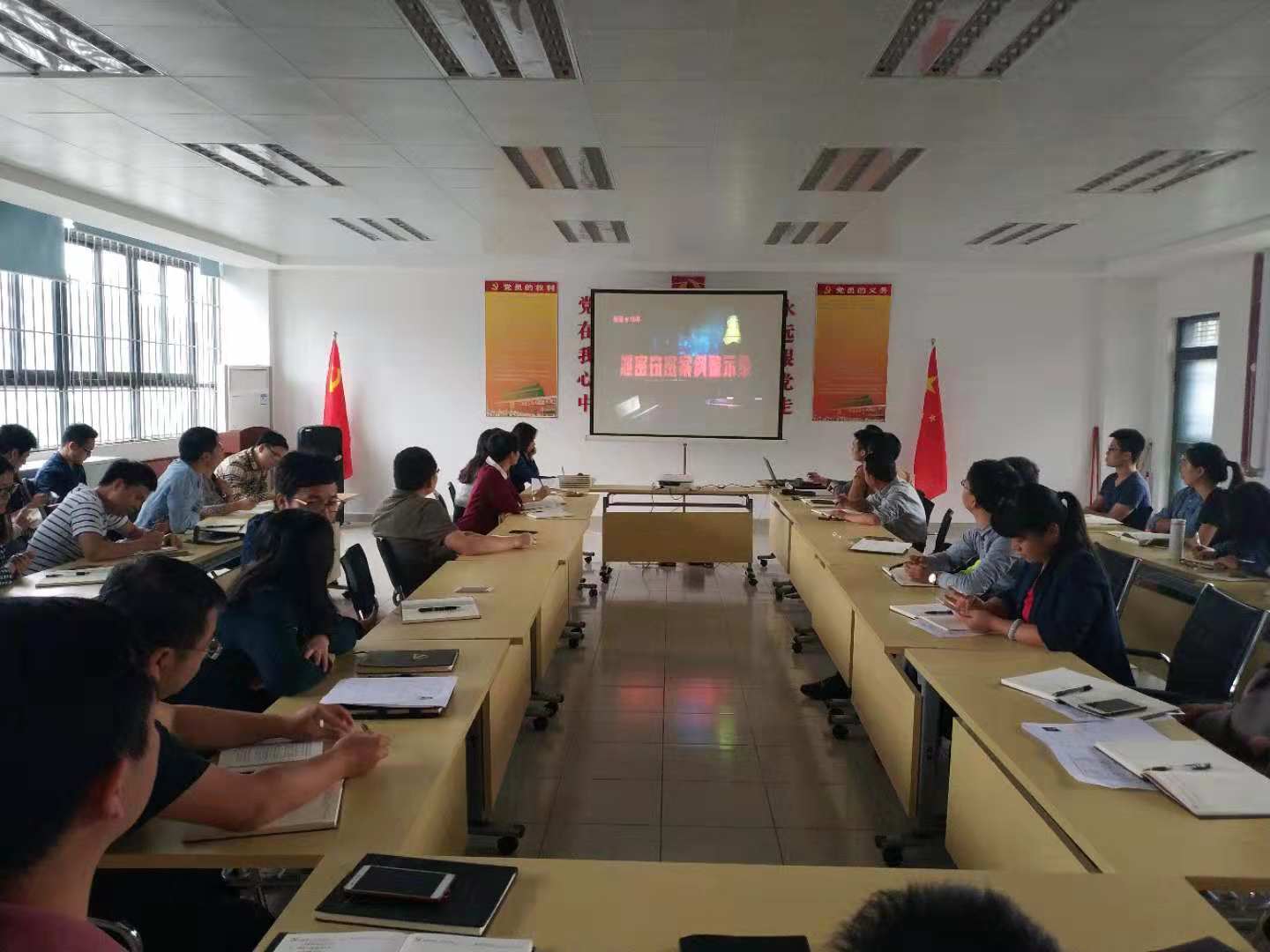 2018年10月11日下午四点,我院组织教工党员在机电楼12L102会议室集中观看保密教育警示片《泄密窃密案例录》。本次学习由学院党总支书记君光主持,全体教工党员参与此次学习。
