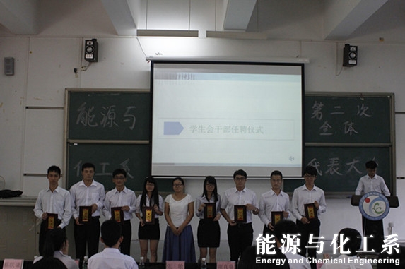 下午15:00,会议准时开始。会议伊始,主持人陈健青介绍与会人员,宣布主要干部名单。在宣读完毕后,进行学生会干部任聘仪式,由张书记颁发聘书。接着,学生会主席刘健文作主席团分工说明和团支书第一副书记蒋和作招干介绍。随后,各部门部长分别对本学年工作展望进行详细介绍,部长们纷纷表示,他们将一定满怀热情,积极认真,任劳任怨,不留余力地服务本系,服务同学!在部长的发言中,他们的决心赢得了全体同学的掌声。此外,在部长发言完毕后,13级能源与动力工程的孙志刚同学作为新干事代表进行发言。之后,由辅导员谢真葵进行发言,并对学生会的工作提出了新的要求与希望。在谢老师发言结束后,能源与化工系第二届团总支学生会干部进行就职宣誓。