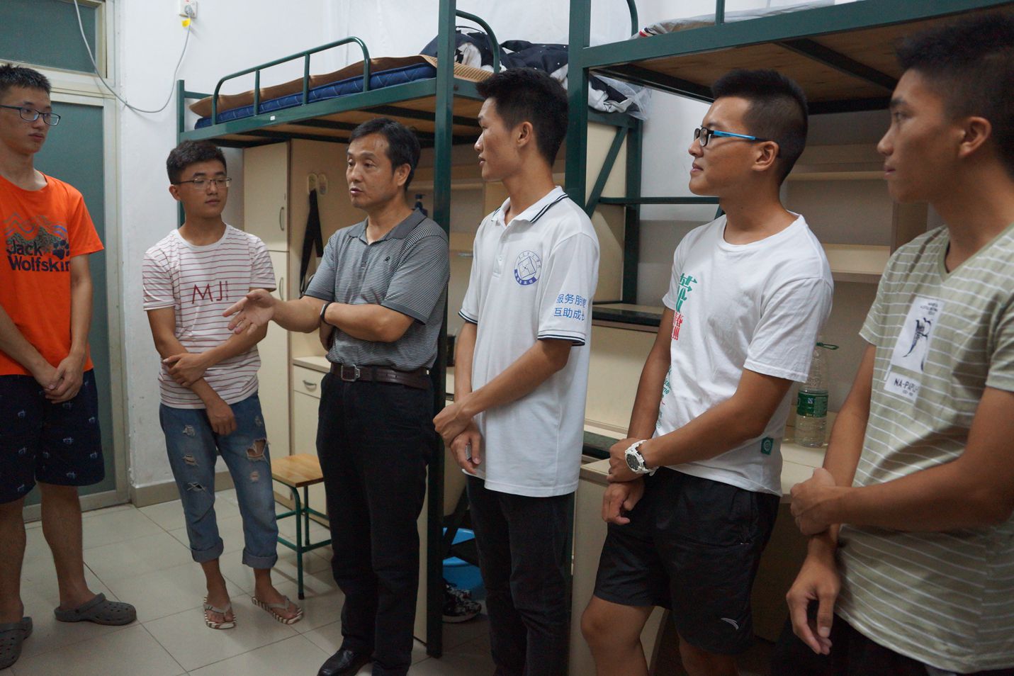 学期开始,为了解我院新生的住宿条件和生活状况,给同学们创造一个良好的学习和生活环境,201792号晚上七点半,9999js金沙老品牌徐勇军院长和君光书记在谢真葵老师和新生班主任们的陪同下到九栋男生宿舍看望了我院刚入学的大一新生。
