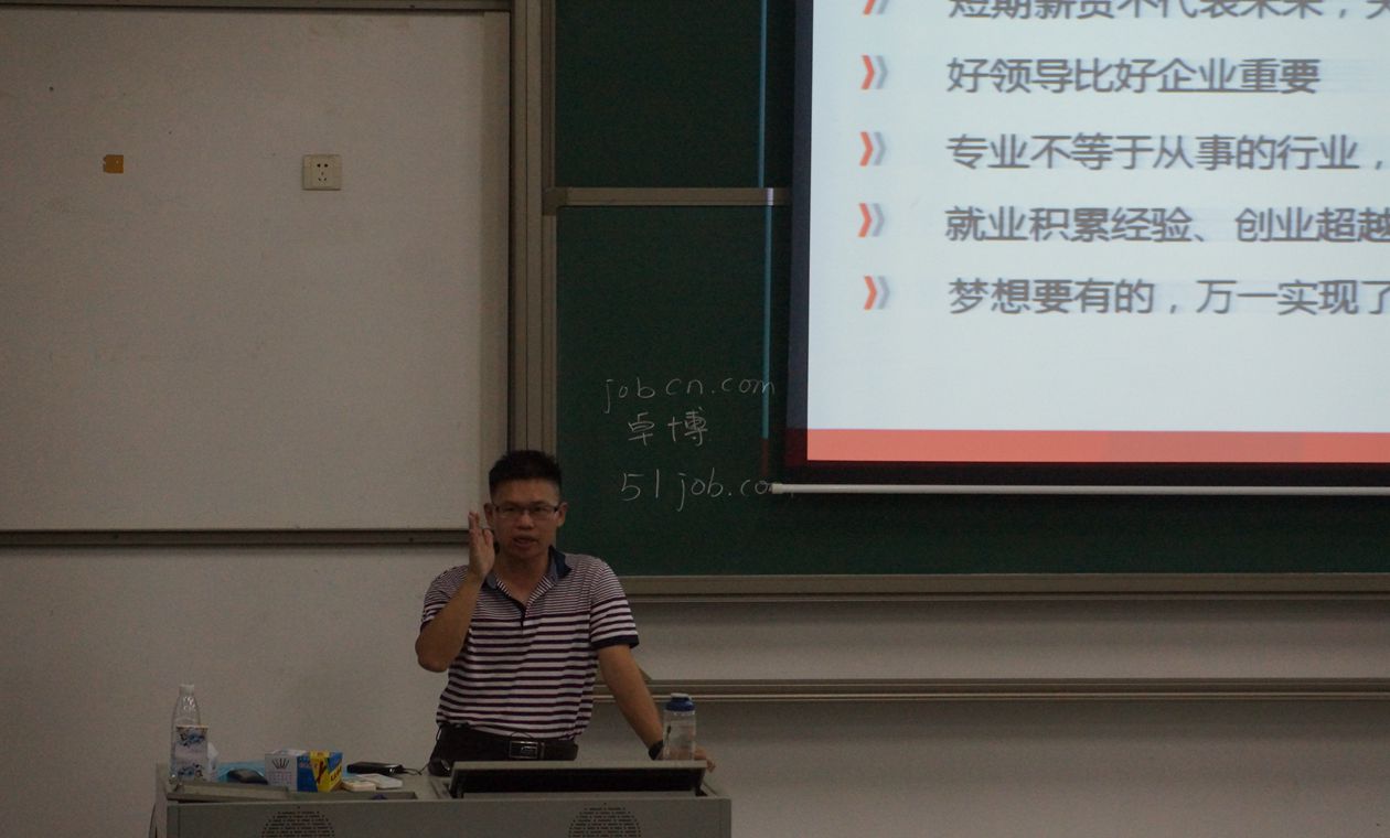 紧接着刘建华师兄谈及了大学生的学习迷茫期这一热点话题,迷茫归于能力的不足,能力其中包括口才、知识和经验等要素,这些因素在很大程度上决定着就业的质量,随后刘建华师兄还给同学们分析了近几年来的大学生就业形势,还强调了岗位是与性格匹配的这一观点,勉励同学们认真学习的同时也要养成好的性格和品质。